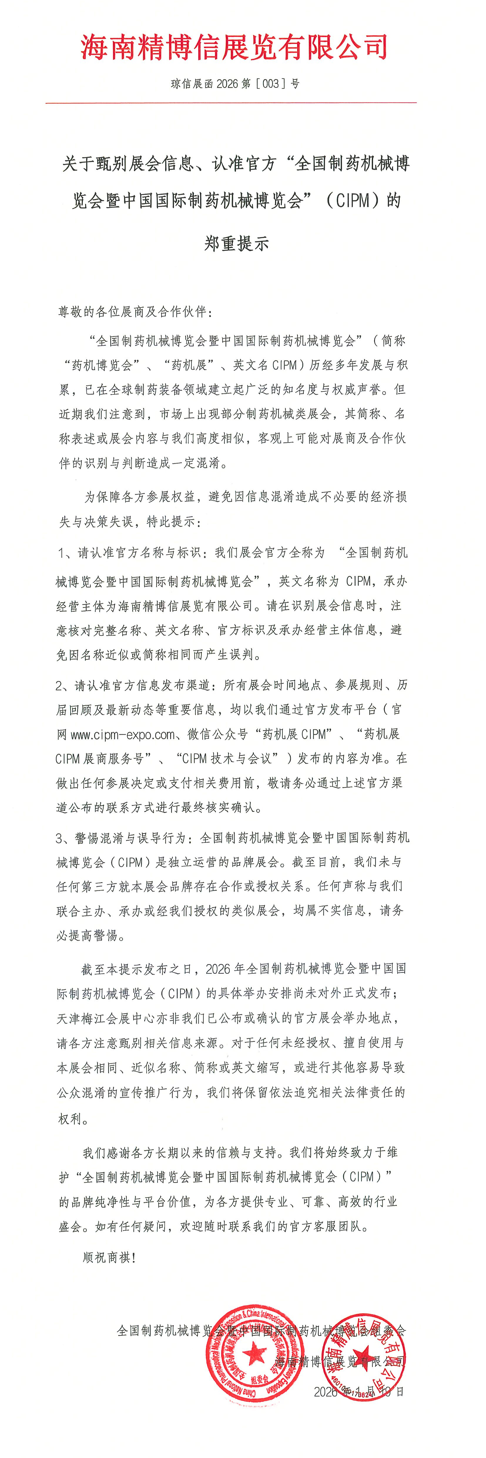 关于甄别展会信息、认准官方"全国制药机械博览会暨中国国际制药机械博览会"(CIPM)的郑重提示